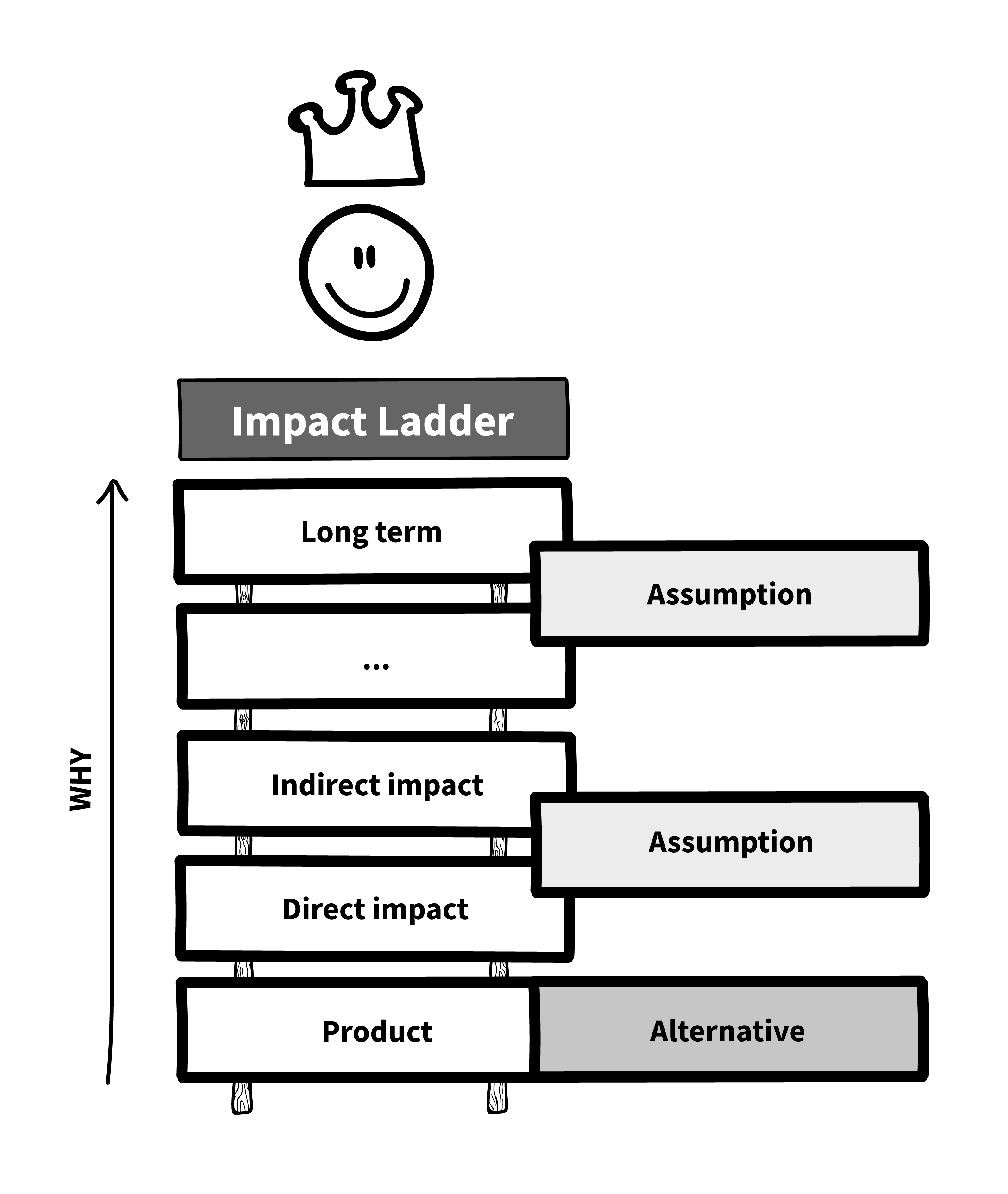 - Visualize assumptions. Like: we assume that by increasing the torque of our drill boor, more people will buy the product'. How can we validate that? This assumption is than put on the Impact Ladder between Drill Boor and Holes (we assume that an improved drill boor will be used for more holes).